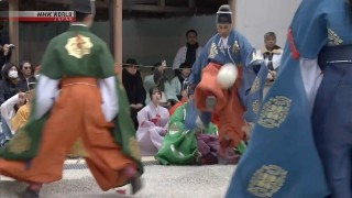 People clad in ancient Japanese court outfits have performed a time-honored ball-kicking game to mark the New Year at a shrine in the western city of Kyoto.