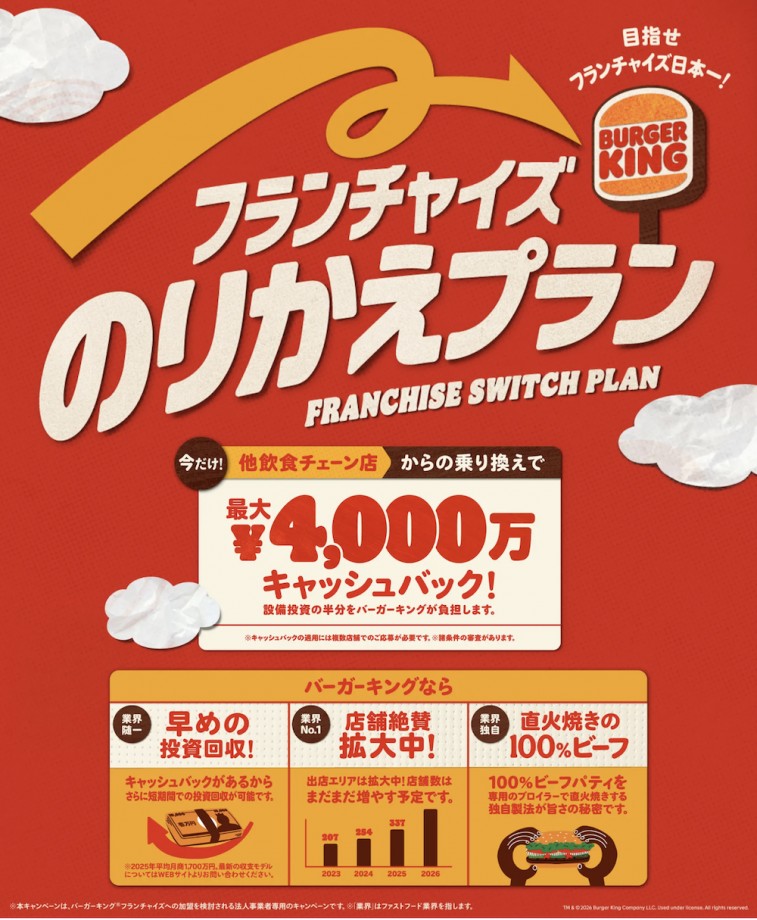 They have publicly announced that they will offer up to 40 million yen cash to any franchise owner of a rival chain, such as McDonald’s or Mos Burger, that has been in business for at least three years and is willing to convert their restaurants to Burger Kings.