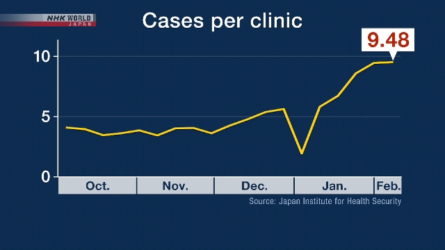 The number of patients per clinic was 9.48 in the week through February 8, up slightly from the previous week. The number of cases remains high for this season.