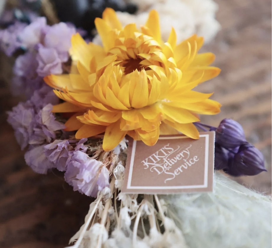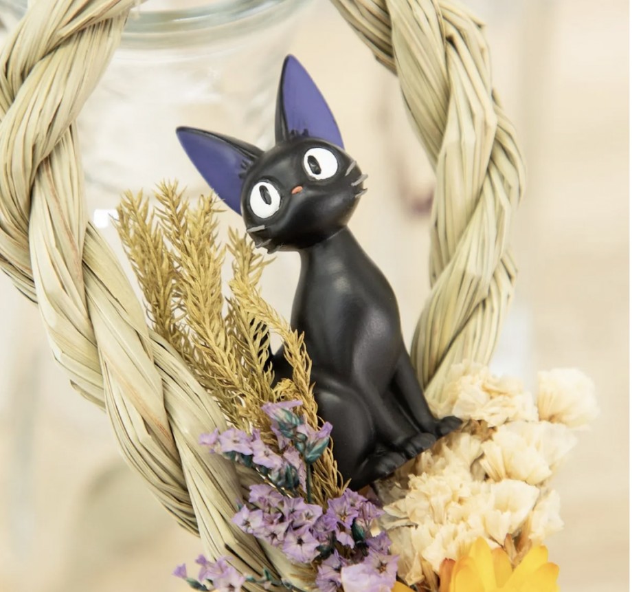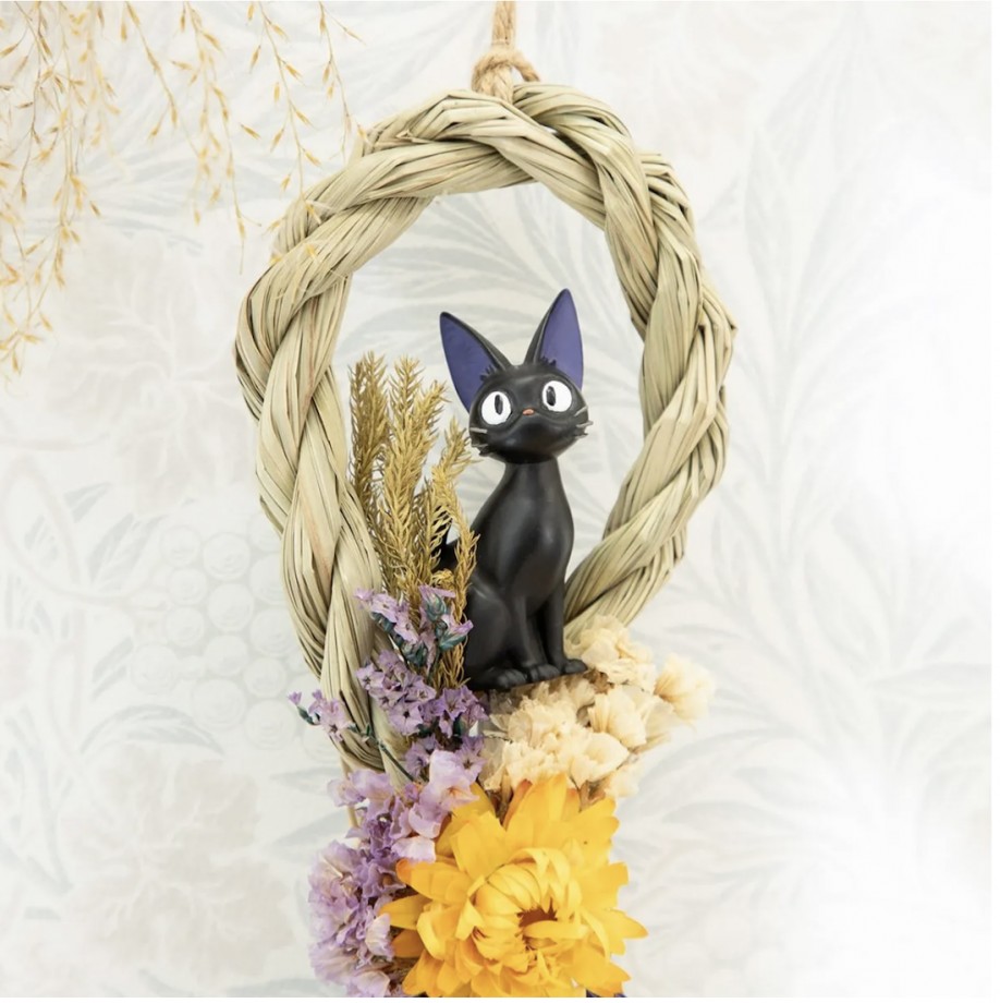 The Jiji figure is made of a mix of metal and resin components, while the wreath uses both artificial and dried flowers, and the straw is natural as well, ensuring that each wreath has its own subtly unique appearance.