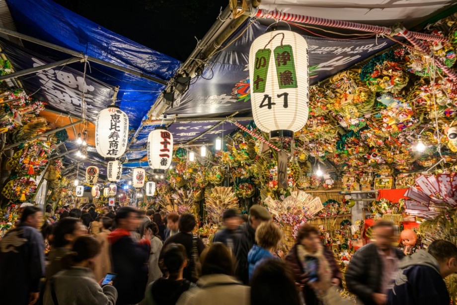 The Asakusa event is one of the largest in the country, with lines of stalls selling ornate bamboo rakes called "kumade."